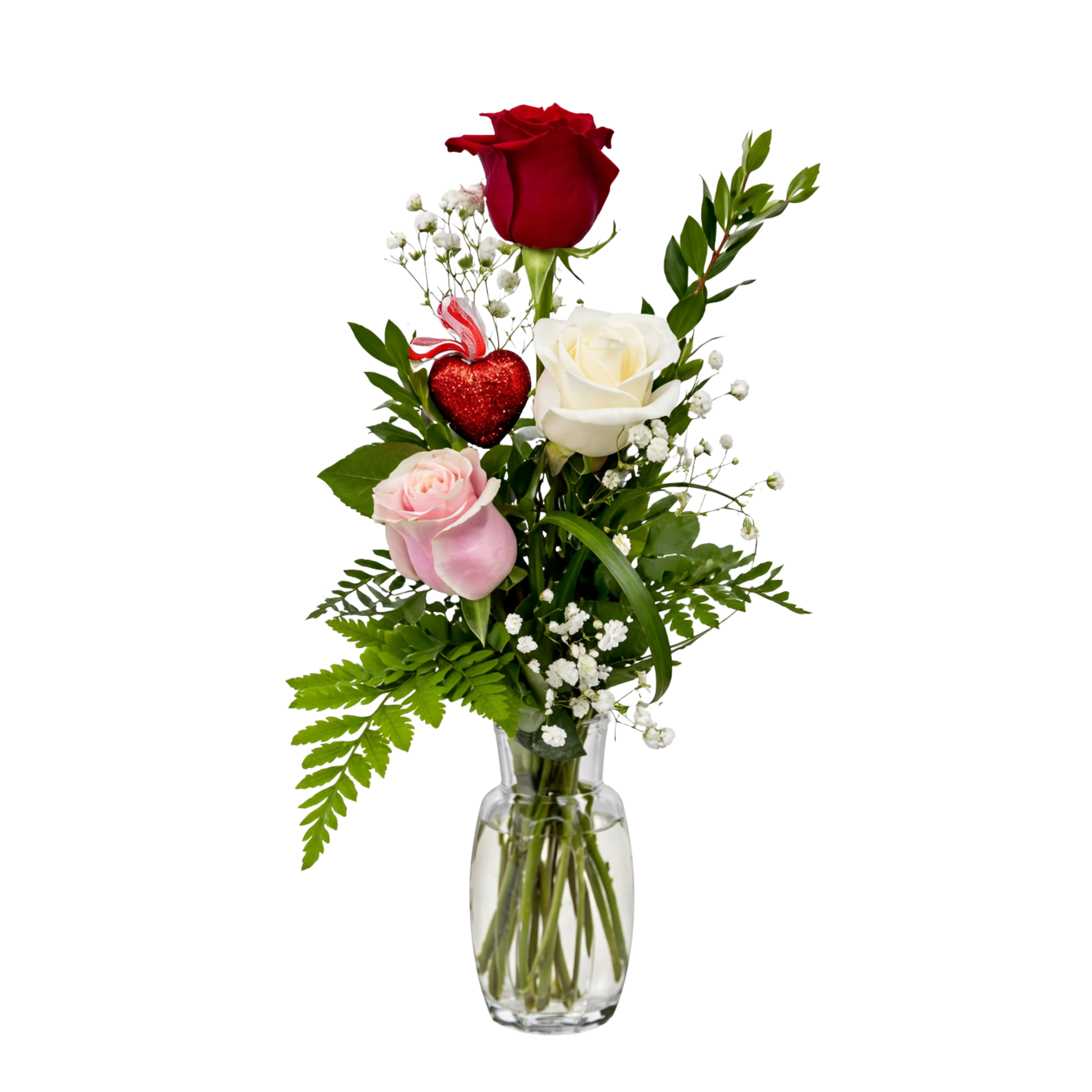 Celebrate lasting love with Forever & Always. Three roses - one red and two mixed colours - are paired with delicate baby’s breath and fresh greenery, beautifully arranged in a sleek glass vase with decorative accents. Elegant, romantic, and perfectly sized, it’s a charming way to say “you’re in my heart forever.”