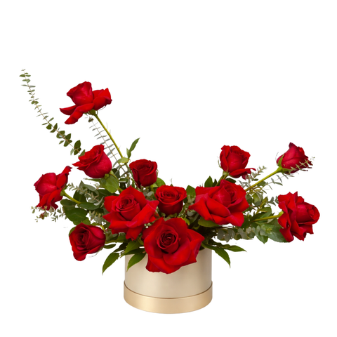 Modern, bold, and effortlessly elegant, this striking arrangement features rich red roses thoughtfully styled with fresh greenery for a clean, contemporary look. Designed in a sleek round box, the asymmetrical shape adds movement and artistic flair, making this arrangement a true statement piece.
