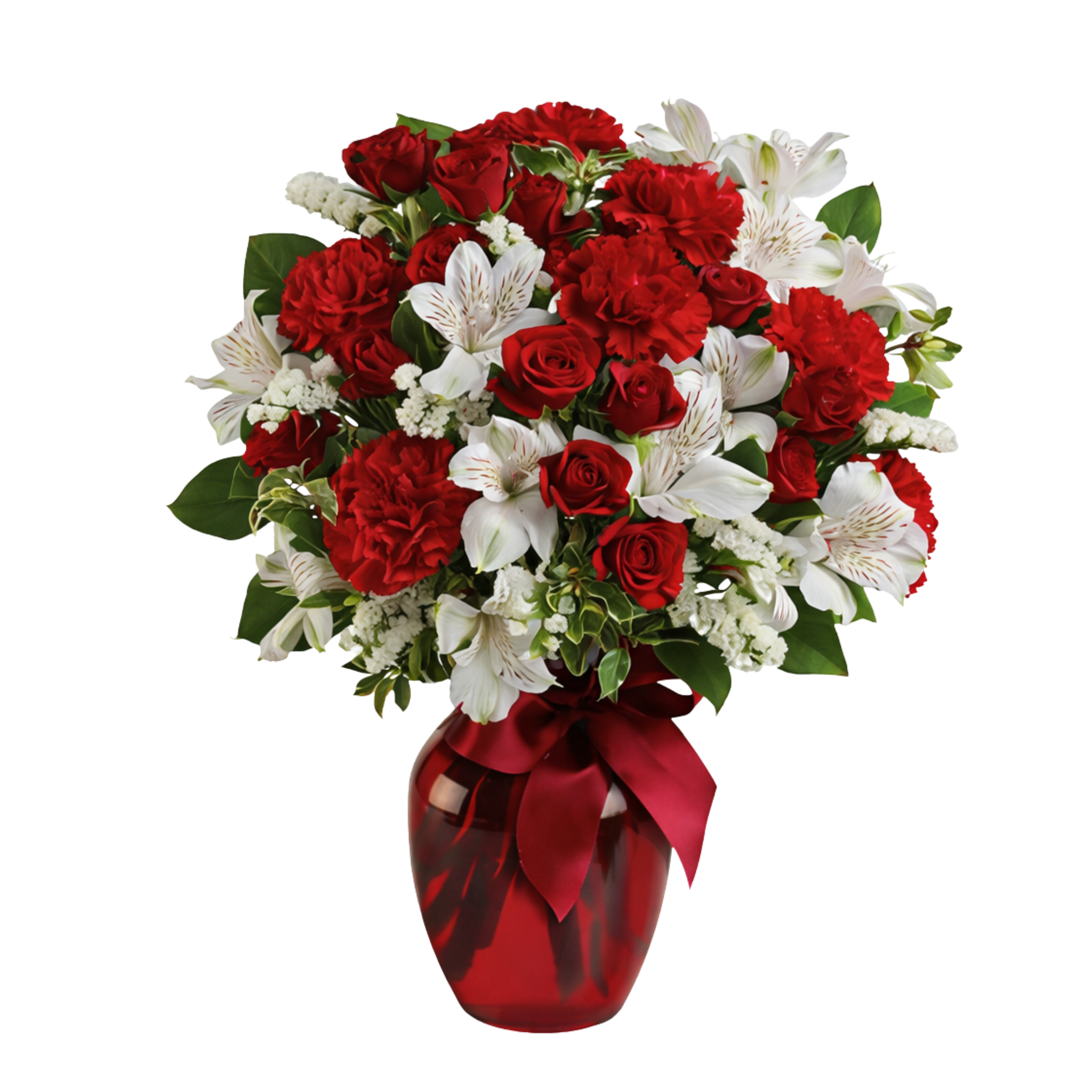 Bold, elegant, and beautifully expressive, this stunning arrangement features rich red roses paired with vibrant red carnations and graceful white alstroemeria. Accented with fresh greenery and designed in a deep red glass vase finished with a coordinating ribbon, the bouquet offers a classic and sophisticated presentation.