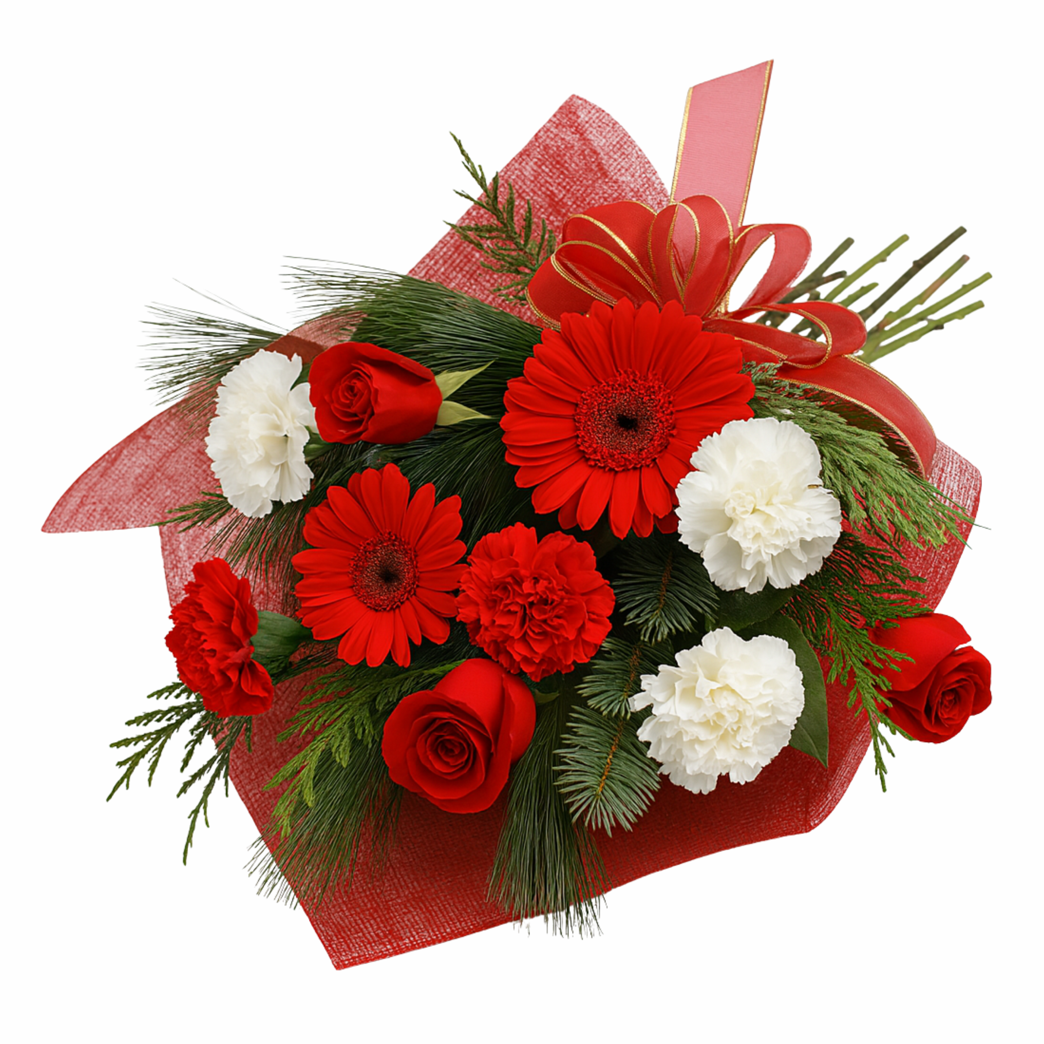 Give your best wishes for a wonderful Holiday this year with this festive bouquet. Red and white flowers arrive nicely wrapped with Christmas greens and a red bow. Featuring a clever mix of red roses, red Gerbera daisies plus red and white carnations. Perfect!