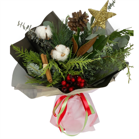 Perfect for bringing the peaceful, crisp charm of the season indoors, this hand-tied bouquet is a stunning way to celebrate the magic of winter. This hand-tied bouquet features Christmas greens, eucalyptus, cotton, a cinnamon stick, a pinecone, berries, and a sparkling star stick all arranged in a festive wrap. Please note that colour, decoration and flower selection may vary.
