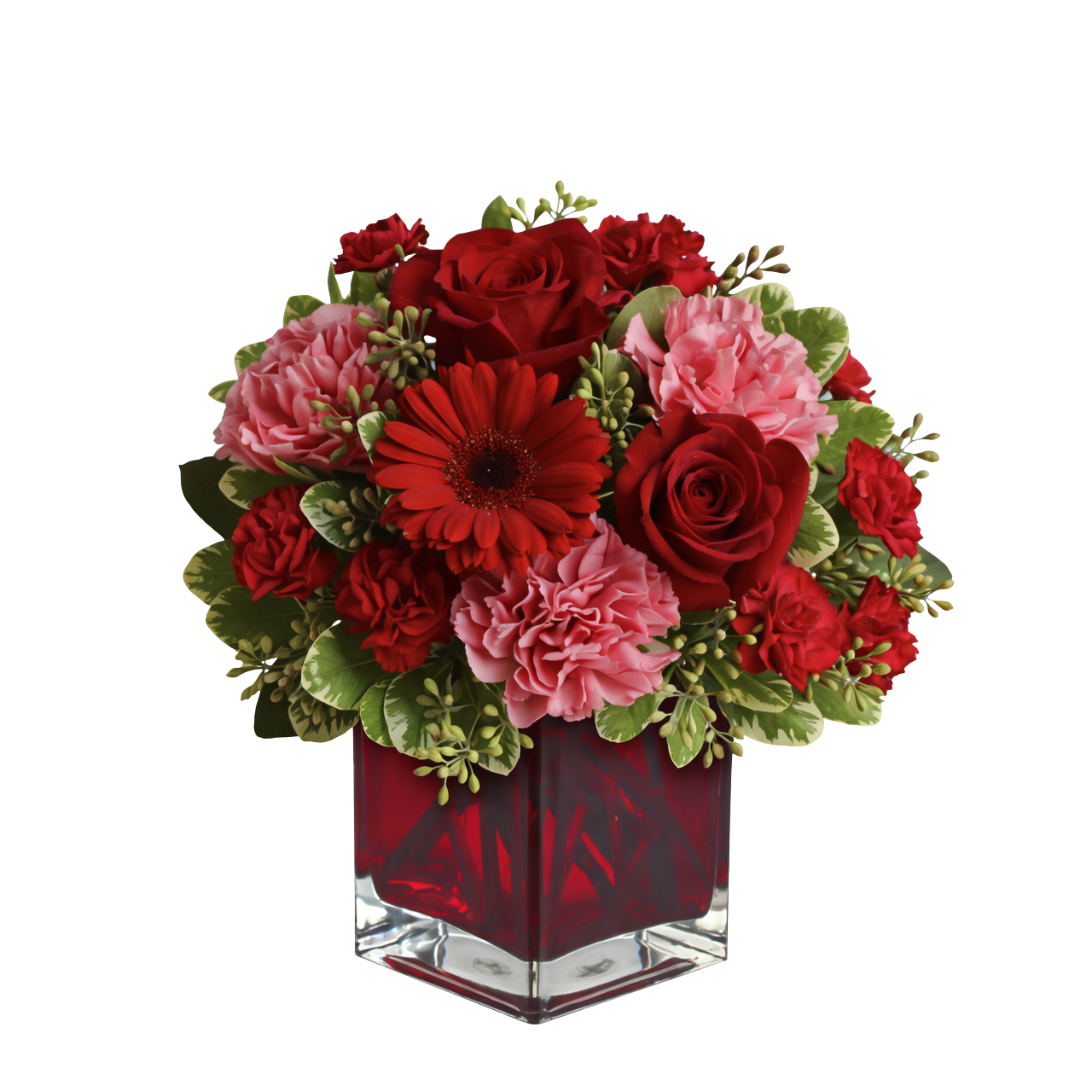 Rich, romantic, and beautifully detailed, this striking arrangement features deep red roses paired with soft pink carnations and a bold red gerbera daisy. Accented with fresh greenery and seasonal textures, the bouquet is designed in a sleek red glass cube vase for a modern and elegant presentation.